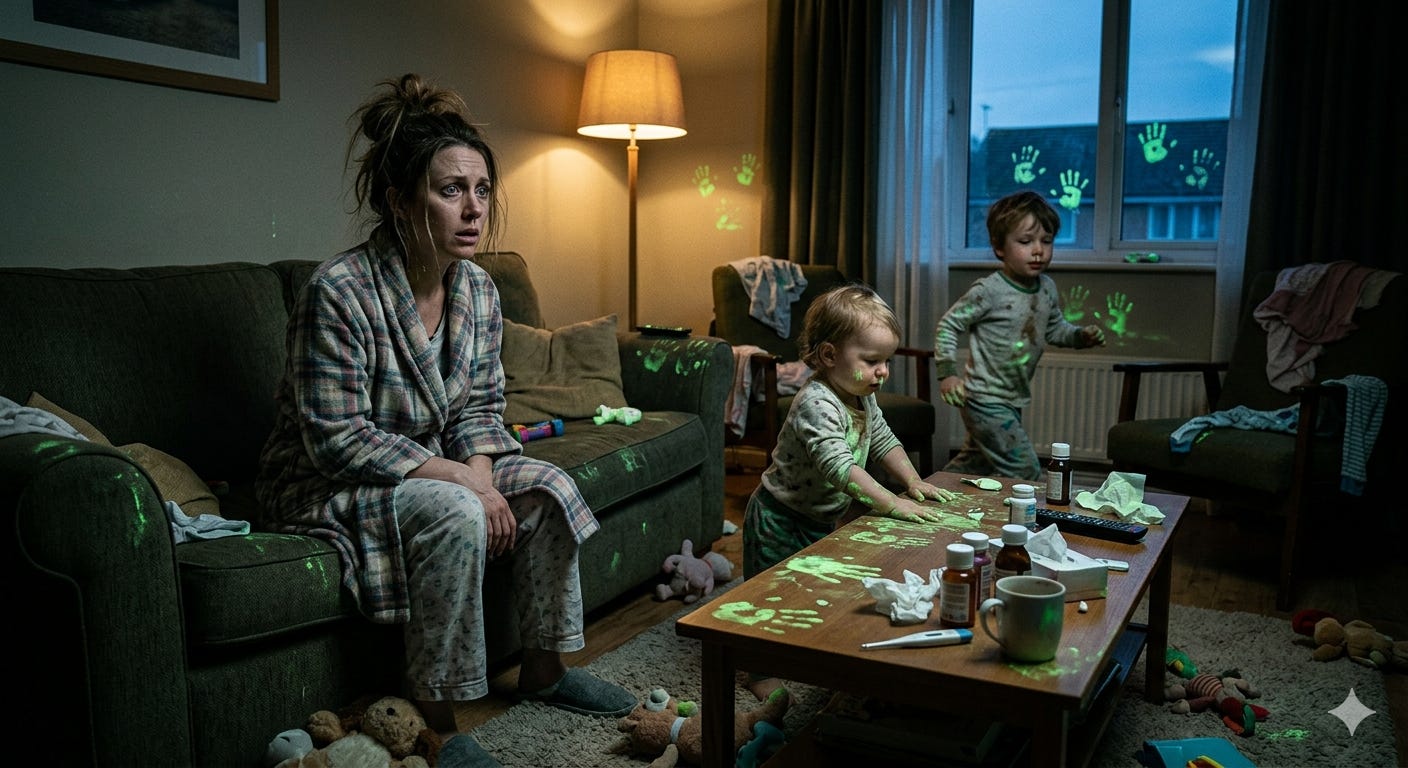 When winter becomes a branded contamination ritual and the family becomes a surface-management problem.